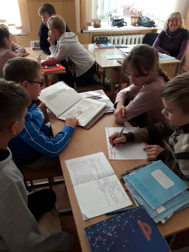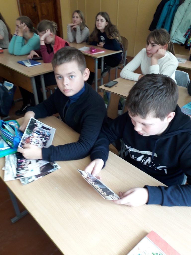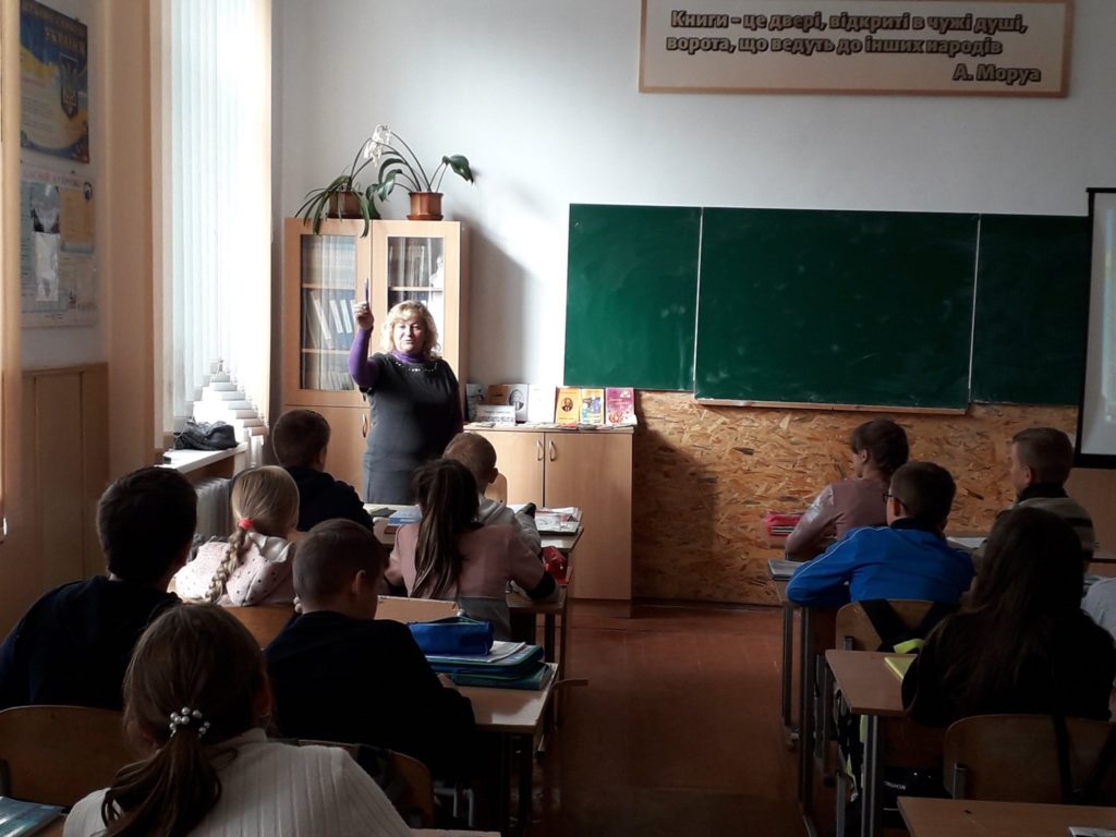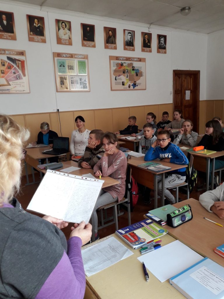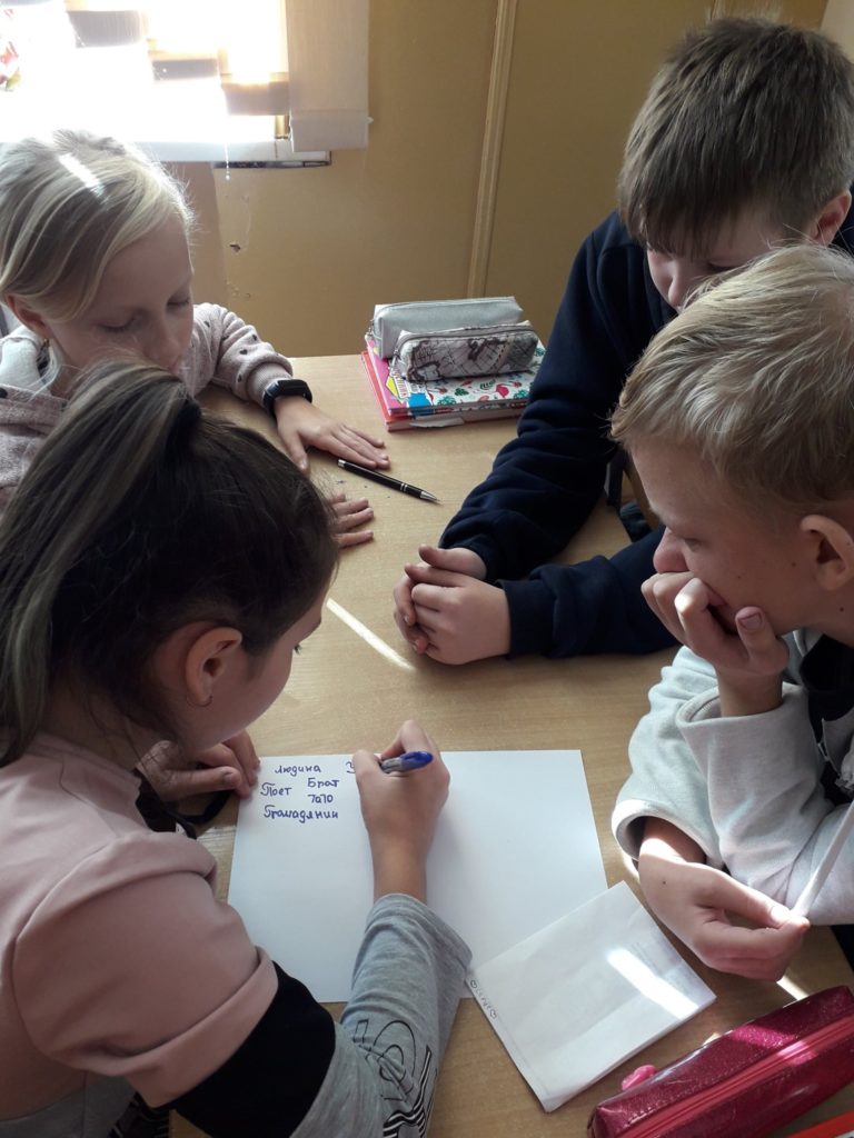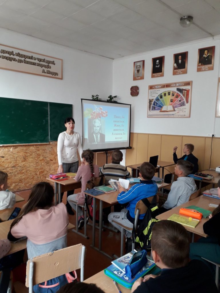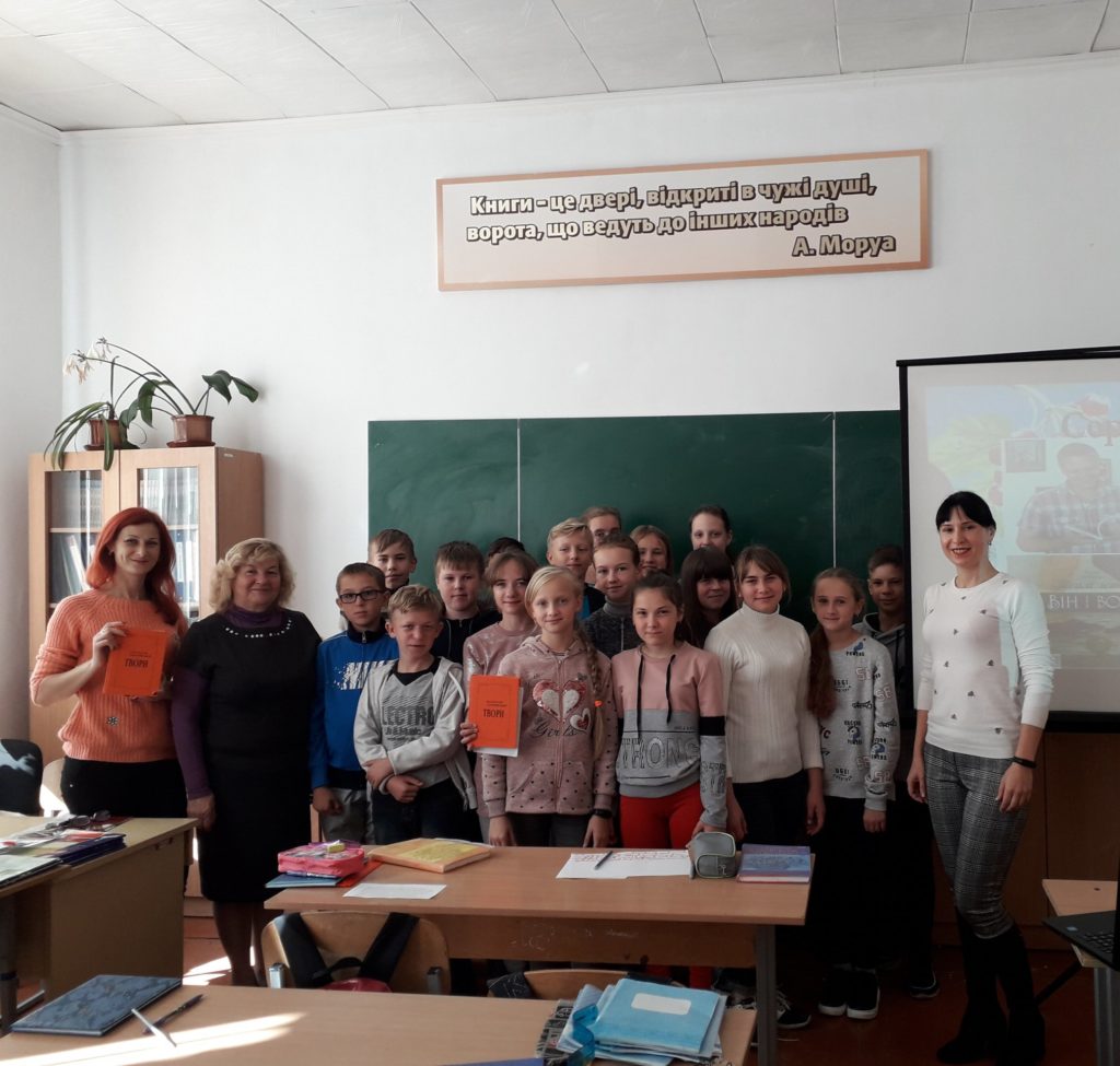 Для закріплення вивченого матеріалу для учнів було проведено гру, в якій вони розділившись на групи, записували слова трьох частин мови: іменників, дієслів та прикметників – відображаючи на папері дані про письменника. Захід пройшов у невимушеній атмосфері, але найбільш активними були: Софія Антіпова, Максим Пилипчук, Антоніна Лостюк, Роман Середа, Дарина Каменєва та Каріна Новак.