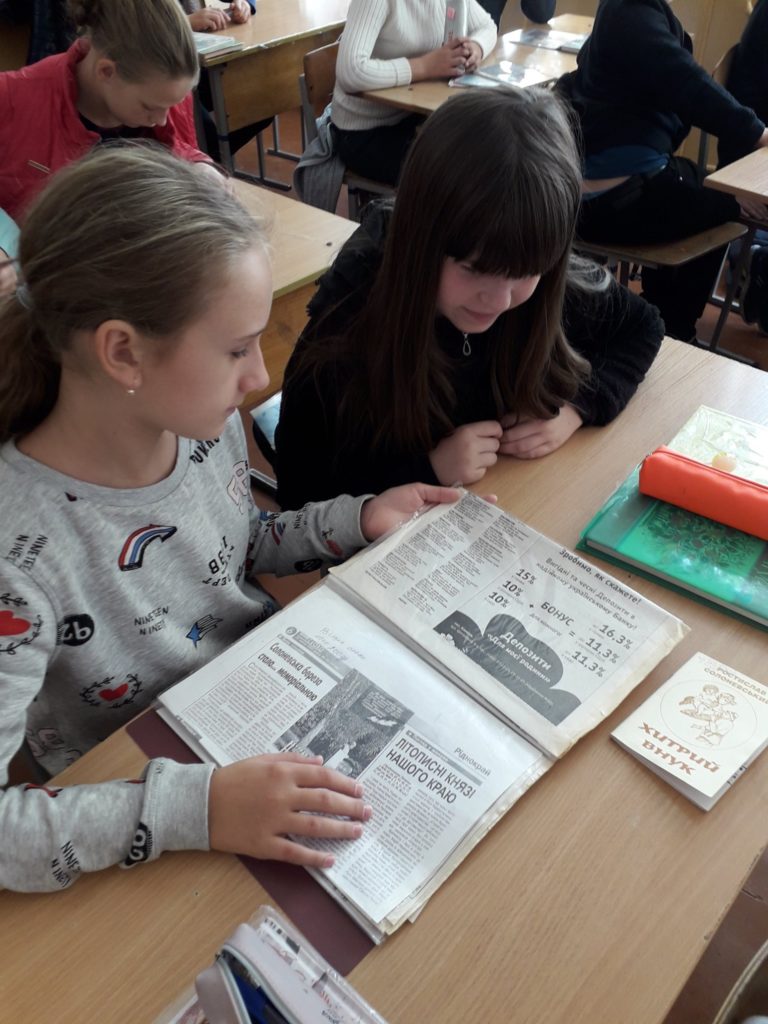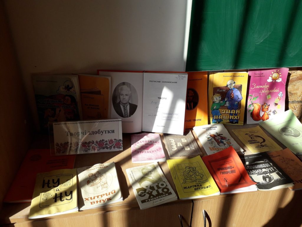 На заняття були запрошені бібліотекарі Публічної бібліотеки Клеванської селищної ради, які представили семикласникам книжкову виставку «Творчі здобутки» та матеріали з музейної експозиції «Ростислав Тимофійович Солоневський – гордість нашого краю». Дана експозиція знаходиться у відділі обслуговування користувачів. В ній представлені: світлини, вирізки з газет, листи переписки з рідними та друзями, особисті речі, копії документів про народження, освіту, дипломи, нагороди, книги та інше.