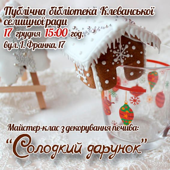 Запрошуємо на майстер-клас по декоруванню різдвяного печива, який відбудеться 17 грудня о 15:00 год у приміщенні відділу обслуговування користувачів Публічної бібліотеки Клеванської селищної ради