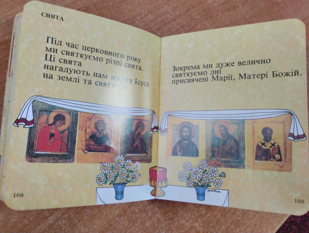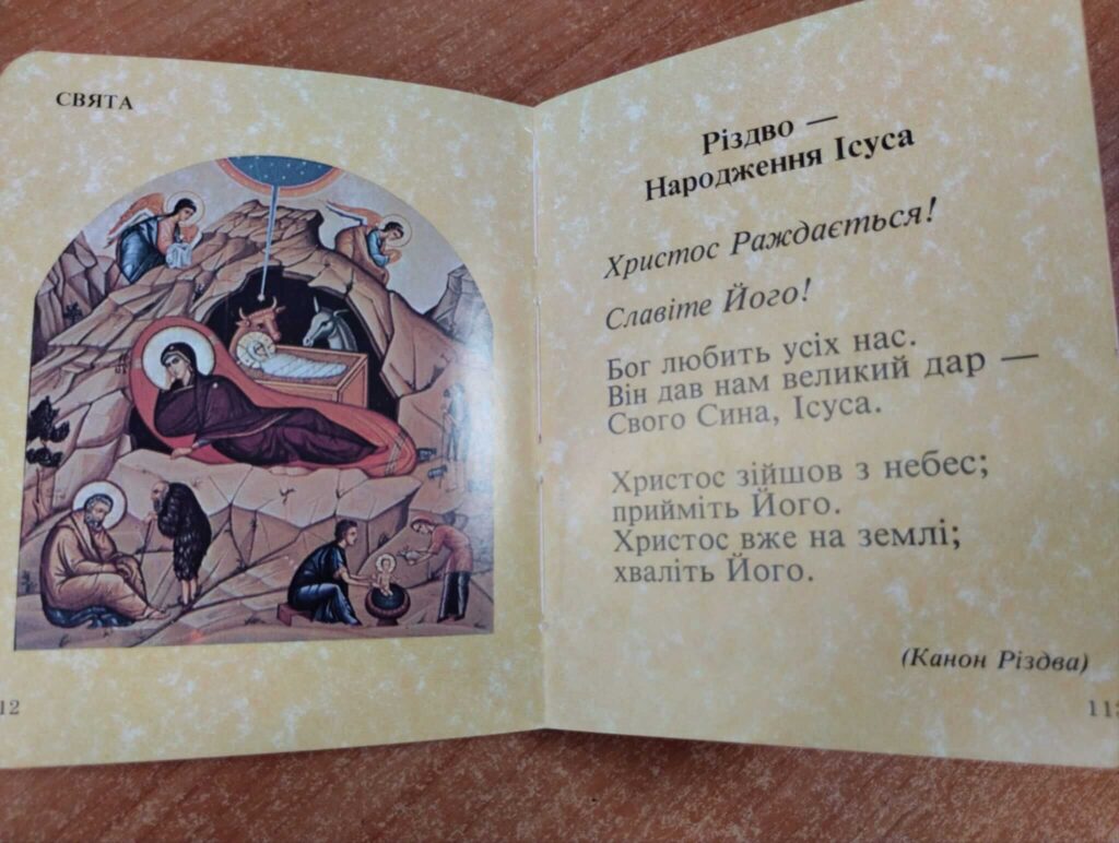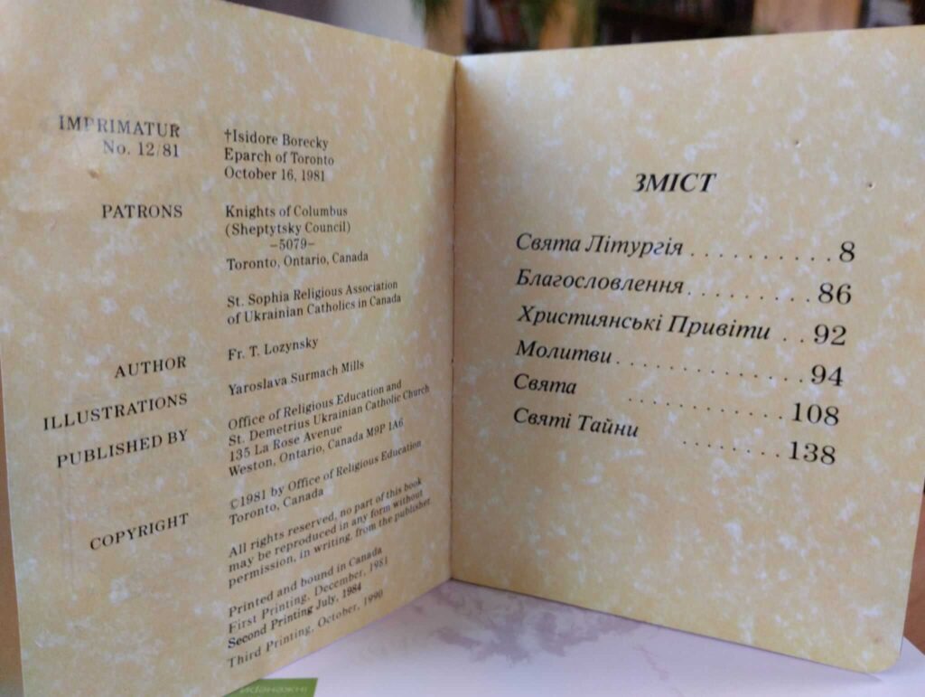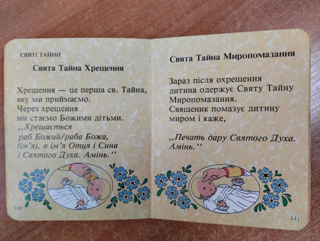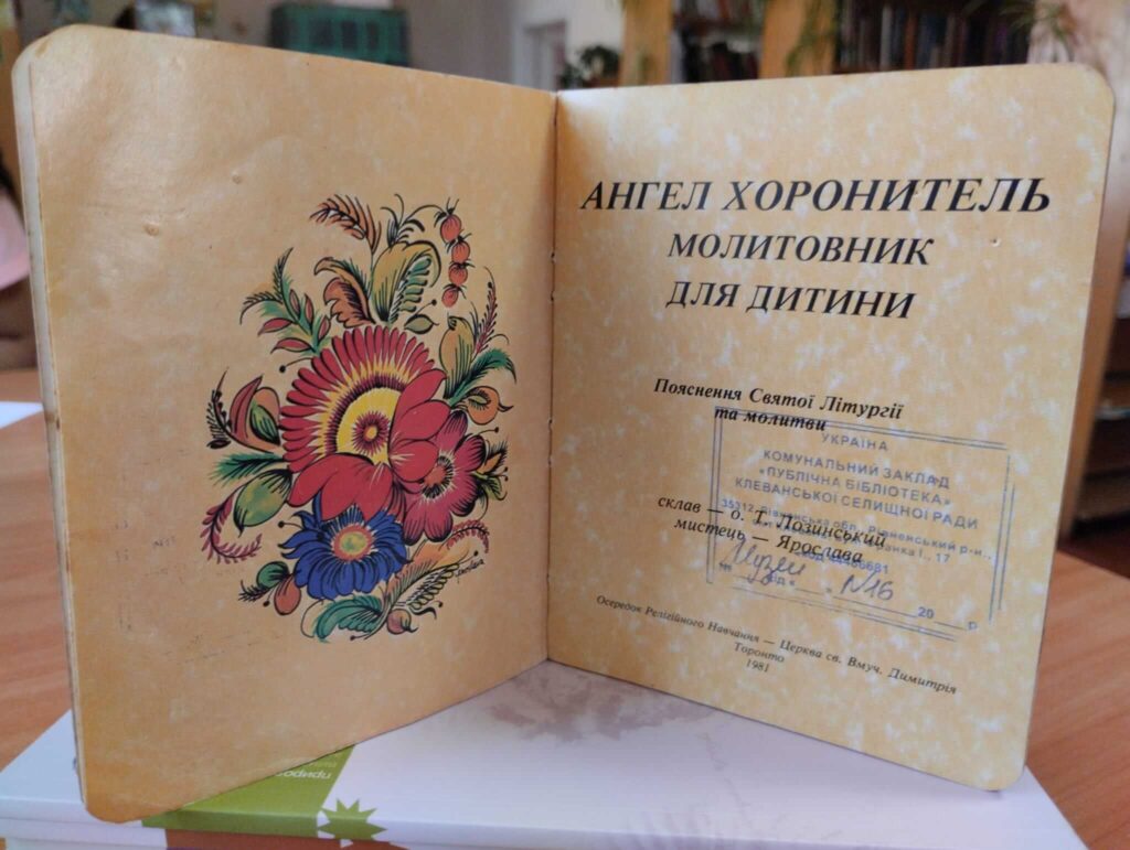 Знайомимо користувачів ще з одним виданням, яке віднині оселиться у нашій музейній кімнаті “Краєзнавчі сторінки Клеваня” – пояснення Святої Літургії та молитви “Ангел Хоронитель: молитовник для дитини”. Це кольорована повністю ілюстрована книга, невеликого формату, яка вийшла друком у 1981 році в Осередку Релігійного Навчання – Церкви Святого Великомученика Димитрія в місті Торонто (Канада). У виданні на 152 сторінки, зміст розрахований на дитячу аудиторію.