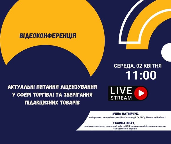 Рівненська ОУНБ організовує відеоконференцію «Актуальні питання ліцензування у сфері торгівлі та зберігання підакцизних товарів». Спікери конференції – Галина Крат, завідувачка сектору організації роботи ЦОП ГУ ДПС у Рівненській області та Ірина Матвійчук, завідувачка сектору інформаційної взаємодії ГУ ДПС у Рівненській області. Роз’яснюватимуться питання: