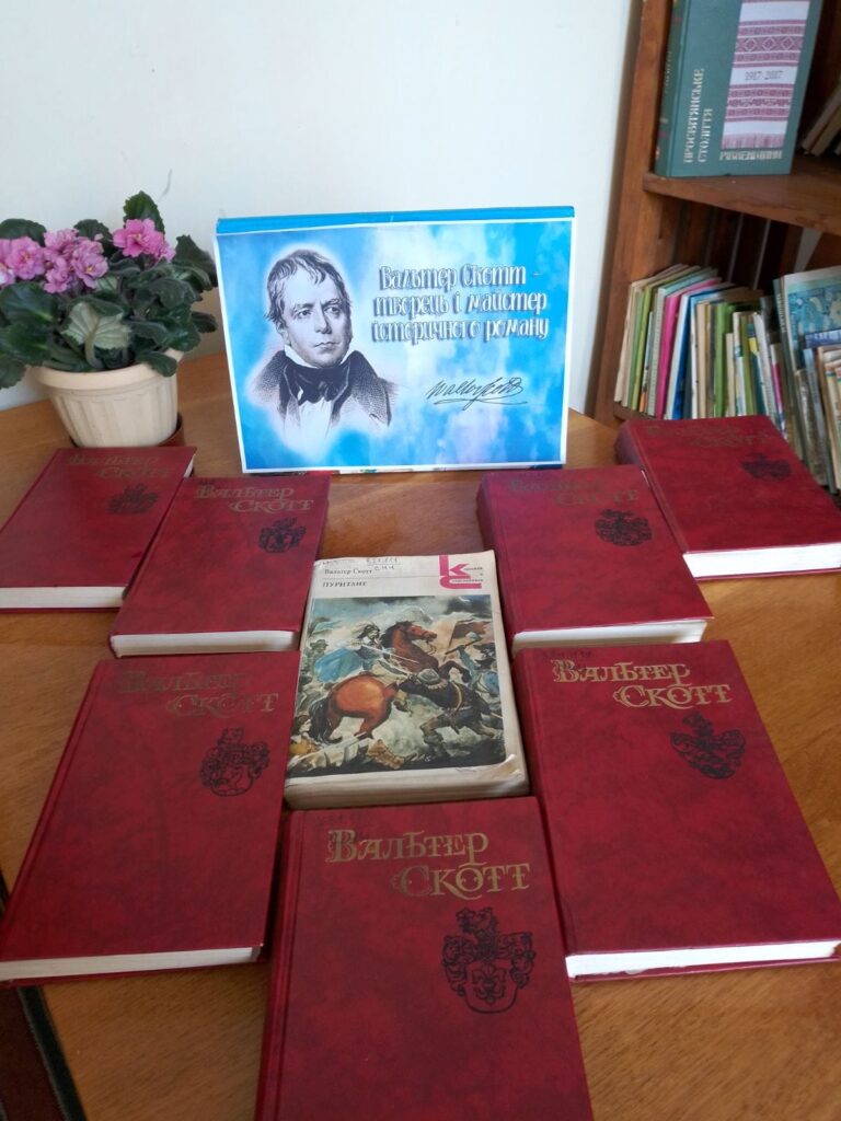 Вальтер Скотт – творець історичних романів. Більше як сто років тому він вважався одним з найвидатніших письменників світової літератури. Його твори користуються незмінною популярністю серед багатьох поколінь читачів. Новаторство письменника полягало в тому, що він уперше в літературі звернувся до жанру історичного роману. Саме цими днями усі прихильники творчості видатного митця відзначають 250-ту річницю від дня народження геніального автора. Якраз до цієї дати, в бібліотеці діє виставка творів письменника. Всі бажаючі можуть відвідати виставку та ознайомитися з книгами представленими в ній.
