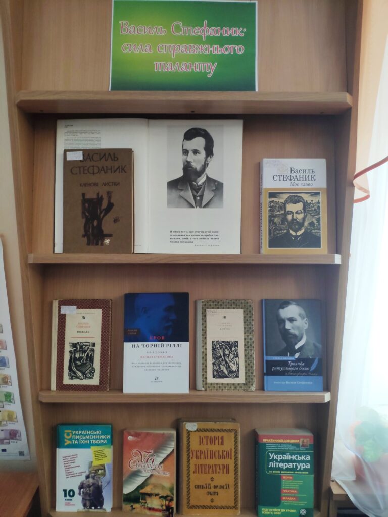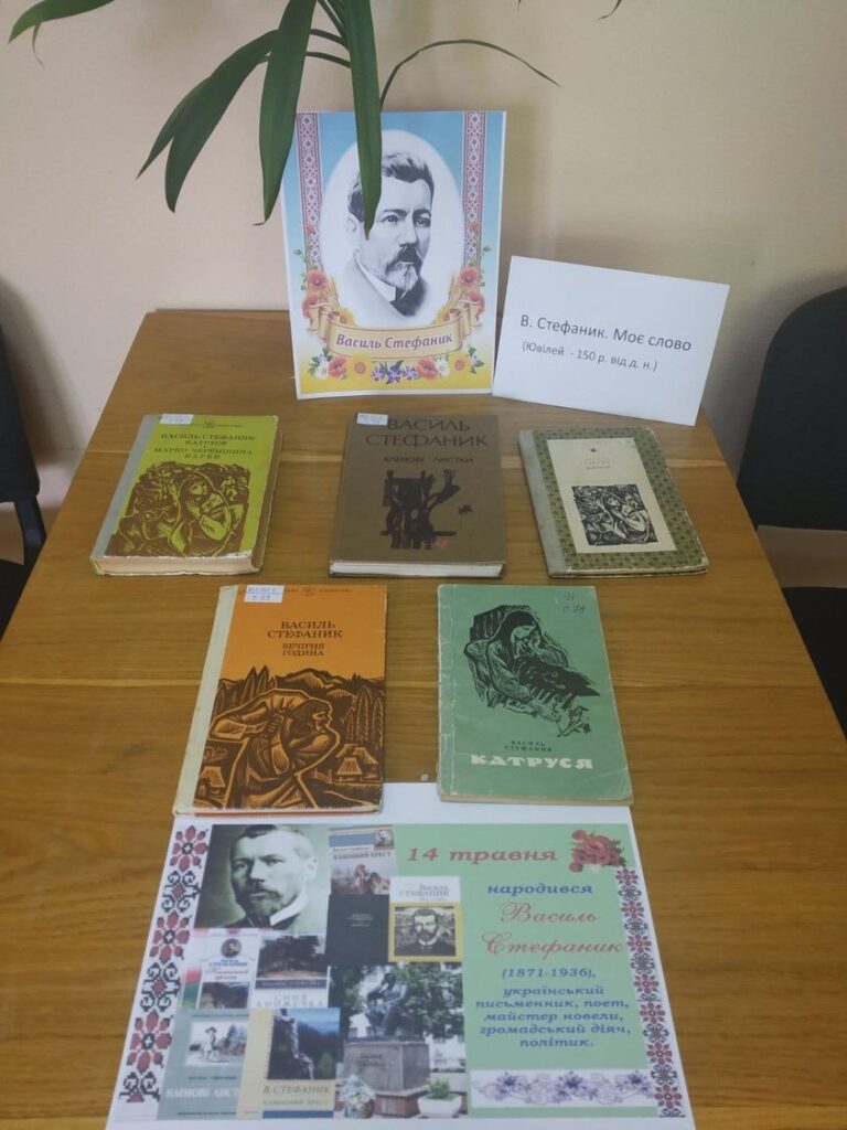 До 150-річчя від Дня народження Василя Стефаника у відділі обслуговування користувачів, вул. І. Франка, 17, до уваги читачів організовано виставку творів письменника. Василь Стефаник народився 14 травня 1871 року в селі Русів на Станіславщині (тепер Снятинського району Івано-Франківської області) в сім’ї заможного селянина Семена Стефаника. Батько отримав у спадок 18 морґів поля, на початку XX ст. мав уже 180. Змалку був дуже відданий матері, цю любов проніс через усе життя. Батько був працьовитим, але мав непростий, інколи авторитарний характер. На освіту сина грошей не шкодував, але долю спланував сам, не зважаючи на його думку. Дитячі роки пройшли в атмосфері прадавніх традицій і звичаїв Покуття, тоді ж пізнав таємничий світ народних пісень, казок, легенд, переказів, познайомився з селянським побутом. Змалечку пас овець, їздив з батьком у поле. Мав двох рідних братів (Володимира і Юрія) та двох сестер. Від матері та старшої сестри Марії навчився співати. Творчість В. Стефаника – не просто майстерне зображення автентичного галицького сільського побуту, політичних обставин того часу, це заглиблення в універсальні аспекти людського життя. Його творчість та манера письма мали великий вплив на розвиток української новелістики. Твори Василя Стефаника перекладали ще за життя. У 1941 році в будинку письменника в селі Русові відкрито літературно-меморіальний музей. Ім’я Василя Стефаника носять: – Премія в галузі літератури, мистецтва, архітектури та журналістики — найвища в Івано-Франківській області відзнака, яку присуджує Івано-Франківська обласна державна адміністрація місцевим авторам – Прикарпатський національний університет – Національна бібліотека у Львові – Публічна бібліотека у Києві – Вулиці у Львові, Тернополі, Коломиї, Стрию – Снятинська ЗОШ І-ІІІ ст. ім. В. Стефаника у м. Снятині в якій колись і навчався – Львівська СЗШ №22.Василеві Стефанику споруджено шість пам’ятників, в тому числі і в місті Едмонтон (Канада) та встановлено чотири меморіальні дошки.