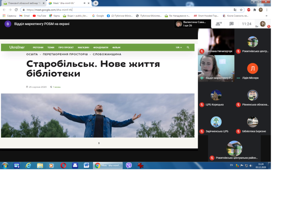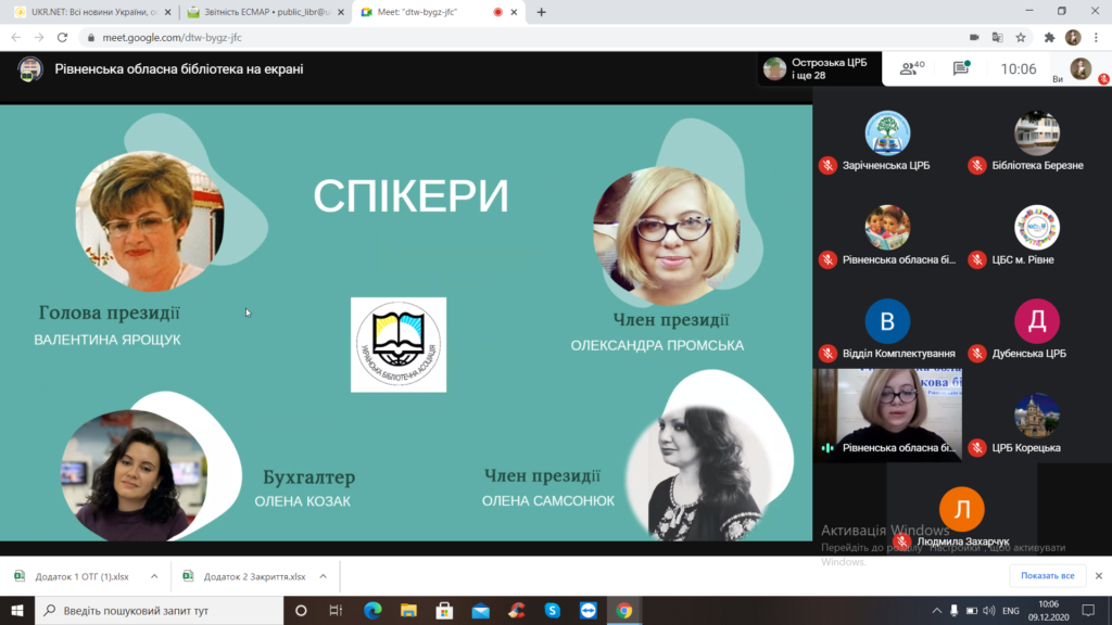 09 грудня 2020 року працівники Публічної бібліотеки Клеванської селищної ради стали учасниками щорічної конференції ГО “Рівненське обласне відділення УБА” присвяченої підведенню підсумків діяльності за 2020 рік, обговоренню орієнтирів та напрямів розвитку бібліотечної діяльності на 2021 рік. Також в етері відбувся професійний діалог у форматі питання-відповідь. Зустріч відбулася в онлайн форматі завдяки платіформі Google Meet. #ГО_РОВ_УБА #РОУНБ #бібліотека_на_лебединці