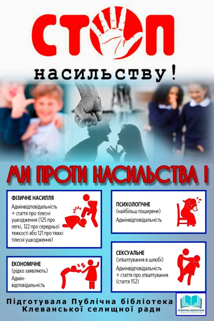 ВСЕСВІТНЯ АКЦІЯ «16 ДНІВ ПРОТИ НАСИЛЛЯ» #16_днів_проти_насилля Цьогоріч з 25 листопада по 10 грудня 2020 року Публічна бібліотека Клеванської селищної ради долучилася до участі у Всесвітній акції «16 днів проти насилля», яка спрямована на те, щоб привернути увагу суспільства до проблем насилля в сім’ї, торгівлі людьми, захисту прав дітей, жінок та інше.Дана акція була започаткована Першим всесвітнім інститутом жіночого лідерства у 1991 році.Шістнадцятиденний період кампанії охоплює наступні дати, які є важливими для спільноти: 25 листопада – Міжнародний день боротьби з насиллям щодо жінок; 29 листопада – Міжнародний день захисників прав жінок; 01 грудня – Міжнародний день боротьби зі СНІДом; 02 грудня – Міжнародний день за відміну рабства; 03 грудня – Міжнародний день людей з обмеженими фізичними можливостями; 05 грудня – Міжнародний день волонтера; 09 грудня – Міжнародний день боротьби з корупцією; 10 грудня – Міжнародний день прав людини.Одним з найпоширеніших видів насилля є насилля в сім’ї – результат свідомих агресивних дій одного члена сім’ї щодо іншого. Насправді правопорушники втрачають контроль в результаті внутрішнього психічного та психологічного розладу; «причини», яка провокує насильницьку поведінку. Фахівці рекомендують: інколи щоб не втратити контроль над своїми діями можна просто вийти з кімнати чи квартири.КОНТАКТНА ІНФОРМАЦІЯ ДЛЯ ЗВЕРНЕНЬ, СКАРГ ТА ЗАЯВТелефон довіри Національної гвардії України(044) 226-22-52Національна «гаряча» лінія з попередження домашнього насильства, торгівлі людьми та ґендерної дискримінаціїГромадська організація «Ла Страда»0 800 500 335 (з мобільного або стаціонарного) або 116 123 (з мобільного)Національна дитяча «гаряча» лініяНаразі лінія працює у будні з 12:00 до 16:000 800 500 225 (з мобільного або стаціонарного) або 116 111 (з мобільного).Національна безкоштовна гаряча лінія з питань протидії торгівлі людьми та консультування мігрантівНомери телефону – 527 (з мобільного) та 0 800 505 501 (з мобільного або стаціонарного).Урядова «гаряча лінія»1545, Для громадян України, які перебувають за кордоном: +38 (044) 284-19-15Загальнонаціональна «гаряча лінія» з питань ВІЛ/СНІДНомер телефону 0-800-500-451 (працює цілодобово) (інформацію взято з сайту Національної гвардії України).З метою привернення уваги громадськості до проблем гендерно зумовленого насилля та з метою долучення до Всесвітньої акції «16 днів проти насилля» Публічною бібліотекою Клеванської селищної ради заплановано ряд наступних заходів, які працівники відділу обслуговування проводитимуть для жителів громади. Так підготовано інформаційний онлайн-перегляд «Я маю право», та готується онлайн-виставка книг “Не будьмо байдужими до тих, хто поряд” – форми роботи знайомлять користувачів з літературою про права людини, популяризують її та спонукають до прочитання; до Міжнародного дня інвалідів бібліотекарі планують подарувати книги до книгозбірні Центру реабілітації та лікування нейротравми в смт Клевань; разом з тим наразі готується до випуску плакат «Ми проти насилля» та відеоролик «Скажемо рішуче «НІ!» насиллю».Ірина Громик, директор Публічної бібліотеки Клеванської селищної ради.Світлина з мережі Інтернет.