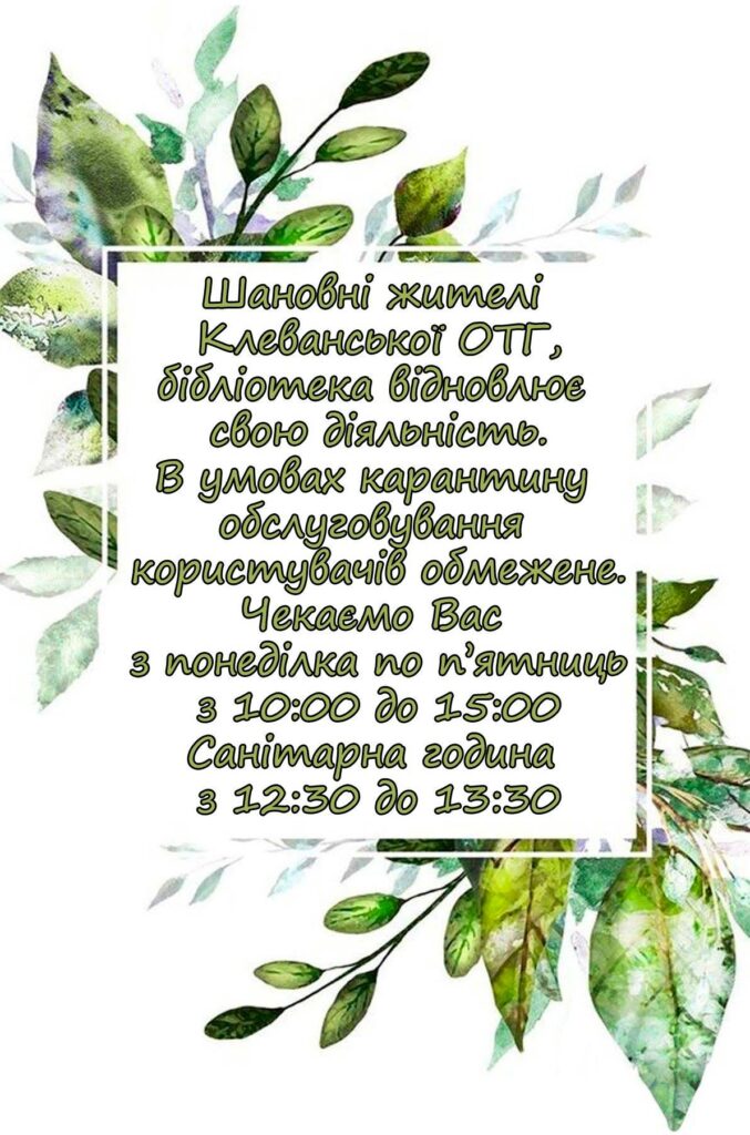 Шановні користувачі, для того, щоб Ви та бібліотекарі відчували себе у безпеці та для уникнення поширення хвороби в Клеванській ОТГ, ми маємо ретельно продумати наше спілкування, забезпечити відповідні умови соціальної взаємодії. Користувачам потрібно дотримуватися маскового режиму і бути в рукавичках, з розумінням віднестися до прохань працівників бібліотеки та дотримуватися безпечної дистанції і не забувати про дезінфекцію рук. Прийняті книги від користувача, бібліотекар відкладає на карантин терміном до 14 днів в окремому місці. Ізольовані примірники будуть виключені з обігу до закінчення їх карантину, після чого вони знову можуть бути видані читачам. Книги мають бути ізольовані, тому що сторінки повернених документів не можна опрацьовувати дезінфікуючими засобами.