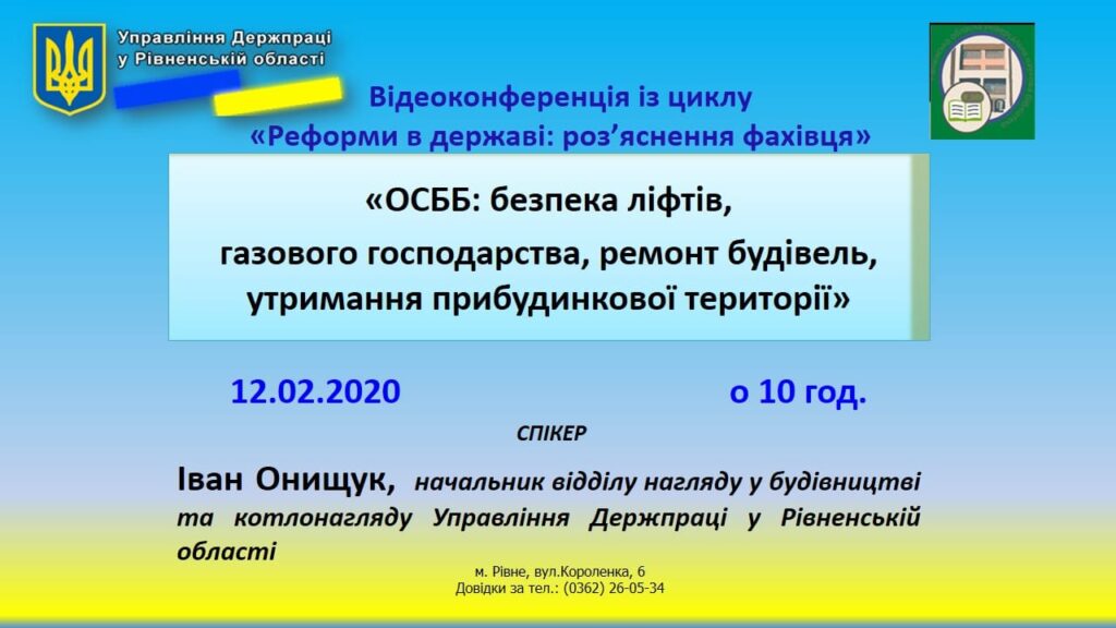 Публічна бібліотека Клеванської селищної ради (відділ обслуговування користувачів вул. І. Франка,17) запрошує жителів громади на відеоконференцію із циклу “Реформи в державі: роз’яснення фахівця” на тему «ОСББ: безпека ліфтів, газового господарства, ремонт будівель, утримання прибудинкової території», яку організовує Рівненська обласна універсальна наукова бібліотека для мешканців області 12 лютого 2020 року о 10 годині Спікер – Іван Онищук, начальник відділу нагляду у будівництві та котлонагляду Управління Держпраці у Рівненській області . Відеоконференція транслюватиметься в прямому ефірі на каналі НТЦ м.Рівне в You Tube: https://www.youtube.com/channel/UCG5GDEe8rJG1Vr3DUgINLXg (в розділі “Прямі трансляції”)