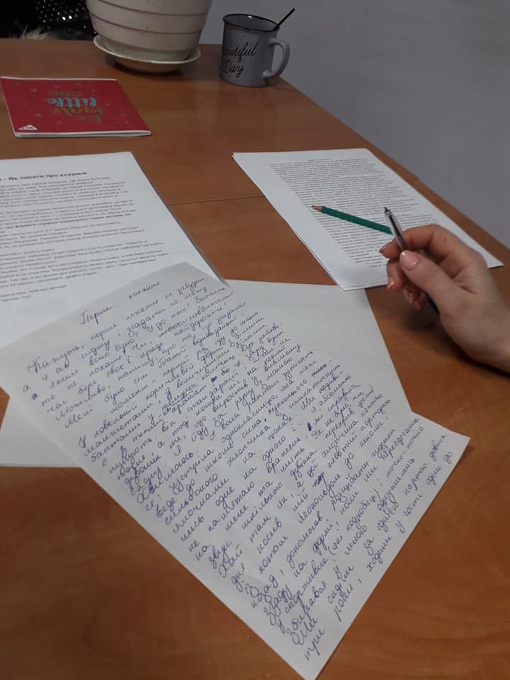 Тема кохання є вічною та завжди актуальною. Що ж, сьогодні пані Таїс Золотковська підготувала нам сюрприз до Дня закоханих.))) Сьогодні ми працювали над трьома письмовими завданнями (ТЕМА ПЕРШОГО КОХАННЯ, ПОЦІЛУНКУ ТА РОМАНТИЧНИХ ВІДНОСИН), ділилися написаним та обговорювали найкращі історії кохання в кіно та літературі.