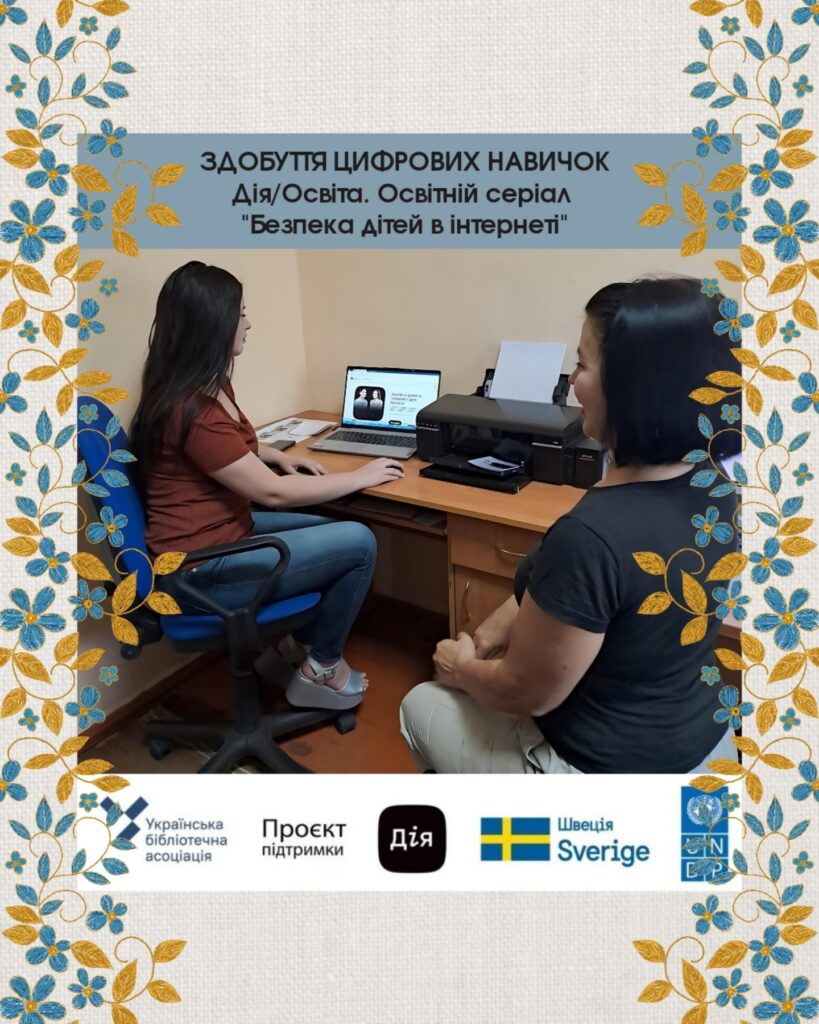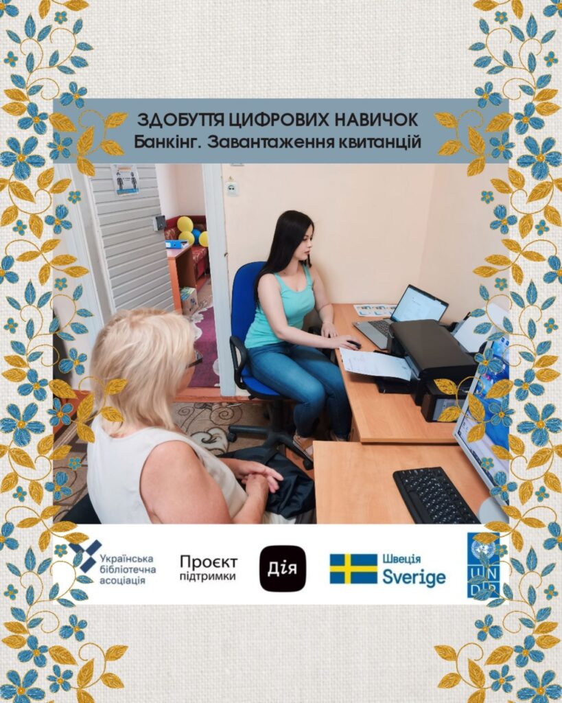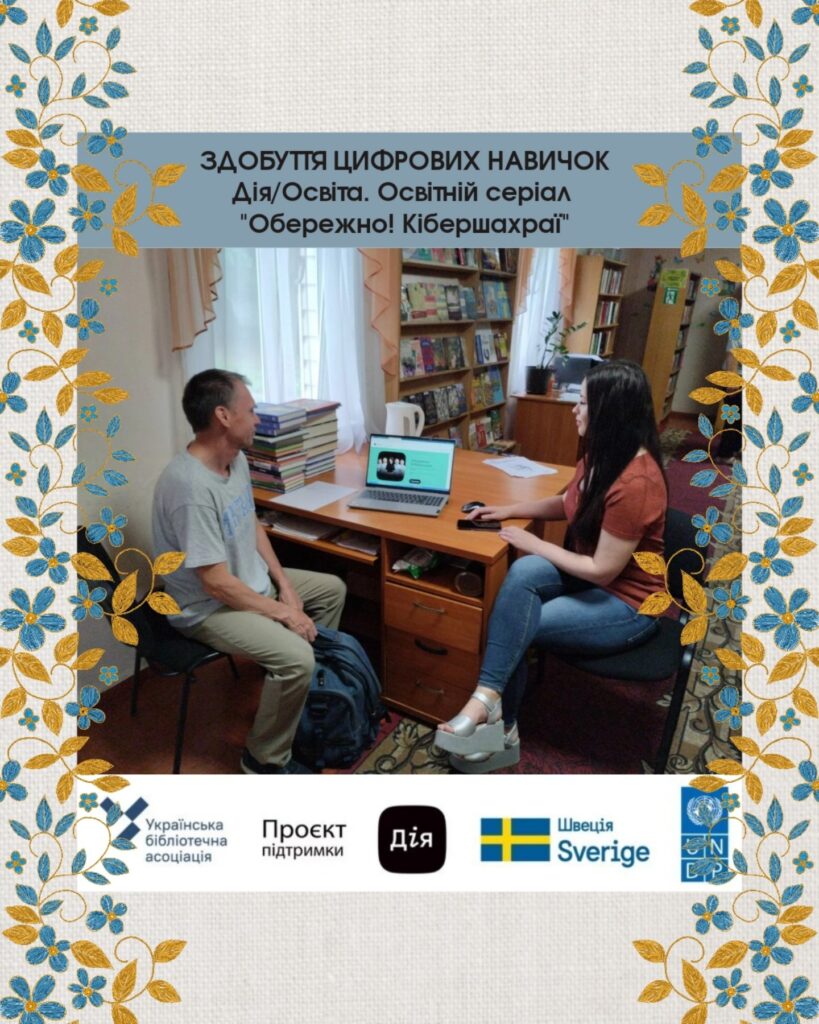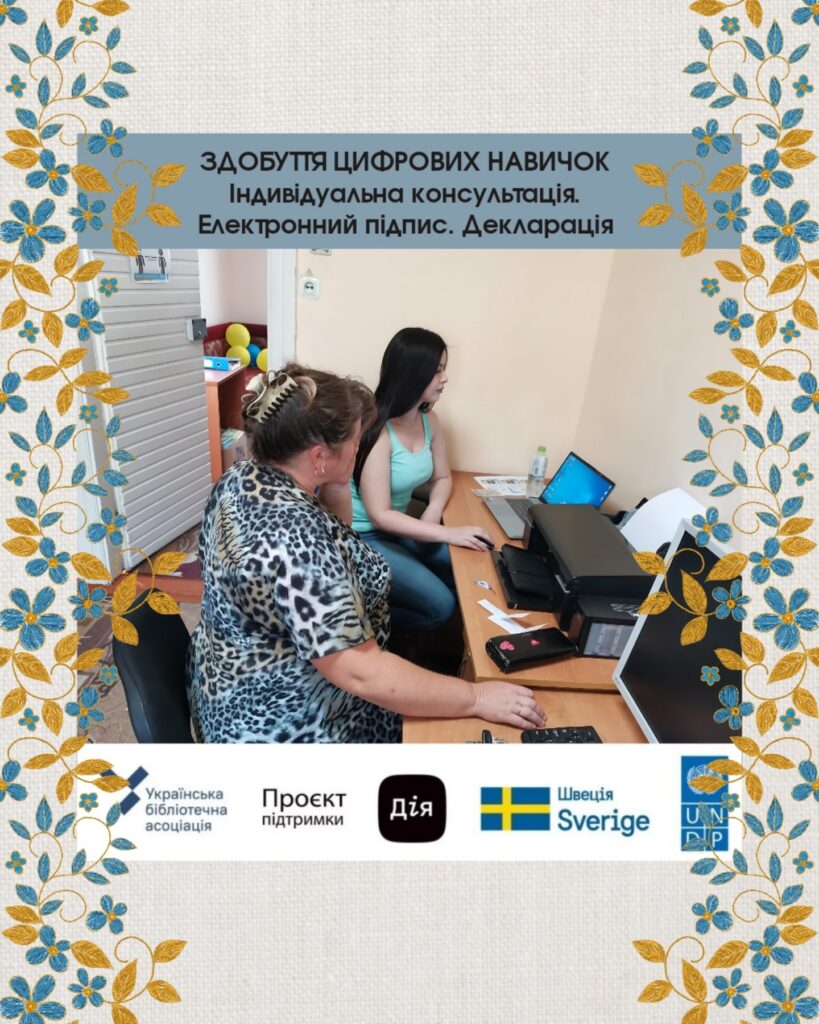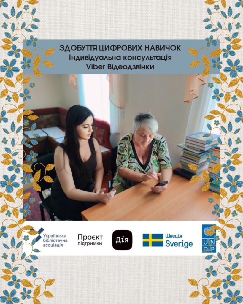 Бібліотеки й під час активної фази війни продовжують свою роботу у напрямі цифрової освіти. Навчання здійснюється в межах проєкту «Здобуття цифрових навичок у бібліотеках – Хабах цифрової освіти. Його реалізує ВГО Українська бібліотечна асоціація за підтримки Програми розвитку ООН (UNDP) в Україні у межах «Проєкту підтримки Дія», що імплементують за фінансування Швеції, та у співпраці із Міністерством цифрової трансформації.Індивідуальна консультація для Руслани в користуванні застосунком Viber, навчалися здійснювати відеодзвінки.