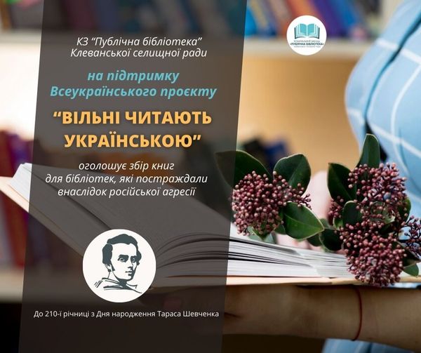 В рамках Всеукраїнського проєкту «Вільні читають українською» комунальний заклад «Публічна бібліотека» Клеванської селищної ради оголошує збір книг українською мовою для поповнення бібліотечних фондів, створення мобільних бібліотечних куточків, формування книжкових поличок в укриттях та в гуманітарних штабах у постраждалих від російської військової агресії областях (Миколаївська, Херсонська, Запорізька, Донецька, Луганська, Харківська, Сумська).