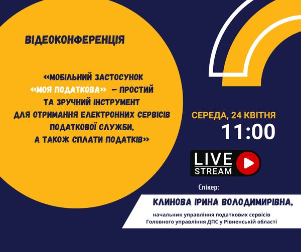 24 квітня 2024 р. об 11 год Рівненська обласна універсальна наукова бібліотека у партнерстві з Головним управлінням ДПС у Рівненській області організовує відеоконференцію на тему «Мобільний застосунок “Моя податкова” – простий та зручний інструмент для отримання електронних сервісів податкової служби, а також сплати податків». Спікер – Ірина Клинова, начальник управління податкових сервісів ГУ ДПС у Рівненській області. Відеоконференція відбудеться в прямій трансляції на каналі YouTube