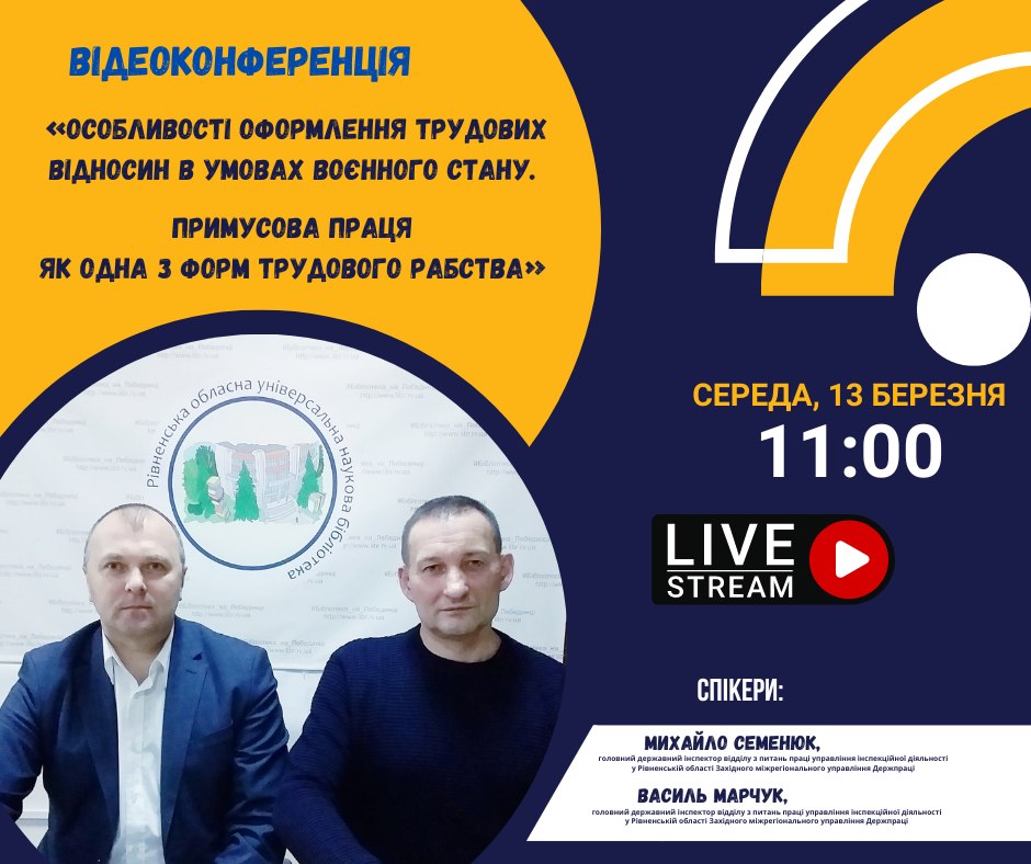 13 березня 2024 р. об 11 год. Рівненська обласна універсальна наукова бібліотека у партнерстві з управлінням інспекційної діяльності у Рівненській області Західного міжрегіонального управління Держпраці організовує відеоконференцію на тему «Особливості оформлення трудових відносин в умовах воєнного стану. Примусова праця як одна з форм трудового рабства».
