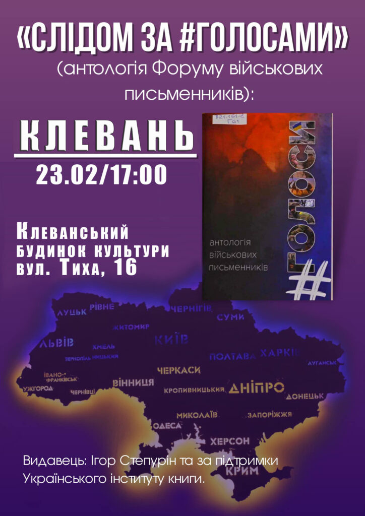 #ГОЛОСИ До другої річниці повномасштабного вторгнення рф в Україну в Комунальний заклад “Центр культури та дозвілля” Клеванської селищної ради” в рамках проведення літературного перформансу «НАМ НАЛЖИТЬ ЦЯ ЗЕМЛЯ» відбулася презентація антології військових письменників #Голоси для мешканців Клеванської ТГ. #Голоси – це не просто книга – це родинний альбом, який створили мужні захисники та захисниці, котрі сьогодні захищають Україну. У збірці зібрані прозові, поетичні тексти та роздуми тридцяти учасників Всеукраїнського форуму військових письменників, що стали рефлексією та своєрідною хронікою пекельних місяців війни 2022-2023 років. Видання вийшло друком у видавництві Ігоря Степуріна за сприяння державної установи Український інститут книги за кошти державного бюджету України та призначене для поповнення бібліотечних фондів. Над створенням книги працювала ціла команда на чолі з директоркою Львівська обласна бібліотека для юнацтва ім. Романа Іваничука та директоркою Всеукраїнський форум військових письменників Тетяна Пилипець Таня Пилипець, яка є упорядницею антології. Станом на сьогоднішній день покликанням бібліотечних працівників, зокрема і Комунальний заклад “Публічна бібліотека” Клеванської селищної ради ,є активне долучення до проєкту «Слідом за #Голосами», адже #Голоси наших захисників мають звучати! Їх повинні чути українці і завжди пам’ятати, яку ціну ми щораз платимо за життя та волю. Таким чином, у Клеванській громаді відбулася презентація книги широкому загалу. #Голоси воїнів-письменників були озвучені директором КЗ «Публічна бібліотека» Клеванської селищної ради Ірина Громик. Безмежне спасибі за сприяння у проведенні презентації колективу КЗ «Центр культури та дозвілля» Клеванської селищної ради на чолі з директоркою Лесею Семенюк.