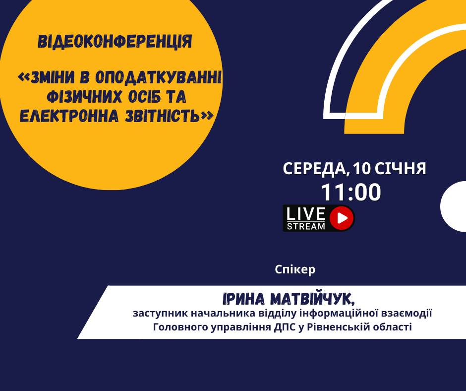 10 січня 2024 р. об 11 год. Рівненська обласна універсальна наукова бібліотека у партнерстві з Головним управлінням ДПС у Рівненській області організовує відеоконференцію на тему «Зміни в оподаткуванні фізичних осіб та електронна звітність».Спікер – Ірина Матвійчук, заступник начальника відділу інформаційної взаємодії Головного управління ДПС у Рівненській області. Відеоконференція відбудеться в прямій трансляції на каналі YouTube