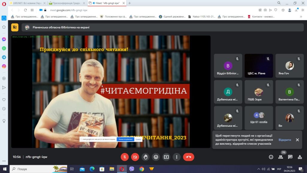 #КлеванськаТГ_читає_Гридіна #Велике_читання_2023 #Рівненщина_читає_Гридіна #Велике_читання_2023_КлеванськаТГ Ми визначилися! У ході інструктивно-методичного обговорення бібліотечних працівників Клеванської ТГ ми підготували план дій та визначилися з книгами, які будемо читати усією громадою. Сергій Гридін пише для усіх категорій читачів. Теми його книг торкаються сьогодення, вони є актуальними, надзвичайно цікавими та повчальними. Тому визначили для Великого читання 2023 п’ять книг, які є у відділах обслуговування КЗ «Публічна бібліотека»: «Віраж»,«Дорослі зненацька», «І паралельні перетинаються», «Кігтик ковбаско», «Сапери». Отож, об’єднуймо громаду довкола читання книг! Зустрічаймося, спілкуймося та обговорюємо! Відповідно до Стратегії розвитку читання на період до 2032 року «Читання як життєва стратегія» формуємо звички та потреби в читанні як обов’язкового компонента життєвої стратегії громадян. Бо читаюча нація – непереможна! Попереду в нас ще багато роботи! А нині – ЗАПРОШУЄМО ЧИТАТИ ГРИДІНА!