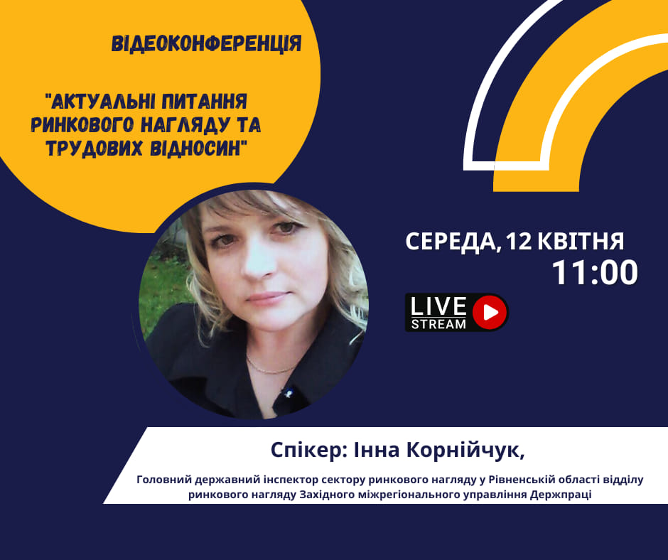 12 квітня 2023 р. об 11 год. Рівненська обласна універсальна наукова бібліотека у партнерстві з Управлінням Держпраці у Рівненській області організовує відеоконференцію на тему «Актуальні питання ринкового нагляду та трудових відносин». Спікер вебконференції – Інна Корнійчук, Головний державний інспектор сектору ринкового нагляду у Рівненській області відділу ринкового нагляду Західного міжрегіонального управління Держпраці.