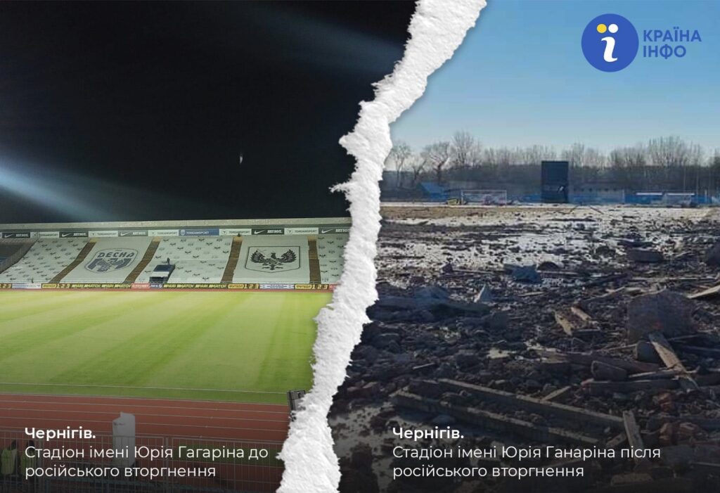 Чернігів: Футбольний стадіон імені Юрія Гагаріна вміщує 12 060 глядачів. Вночі 11 березня стадіон був зруйнований внаслідок авіабомбардування російськими військами. На стадіон ворожа авіація скинула три фугасні 500-кілограмові бомби.
