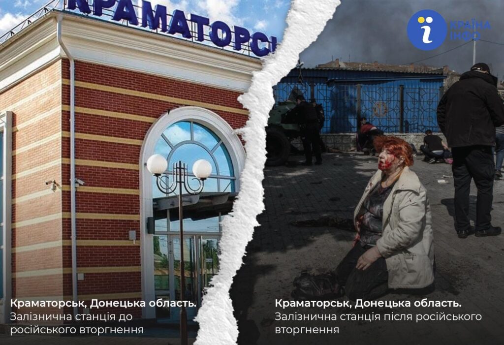 Краматорськ, Донецька область: 8 квітня 2022 внаслідок ракетного удару по станції Краматорськ з боку російських окупантів загинуло, щонайменше, 50 людей та більше 100 поранених, які хотіли евакуюватися із міста поїздом. В момент удару там перебували близько 4 тисяч людей.