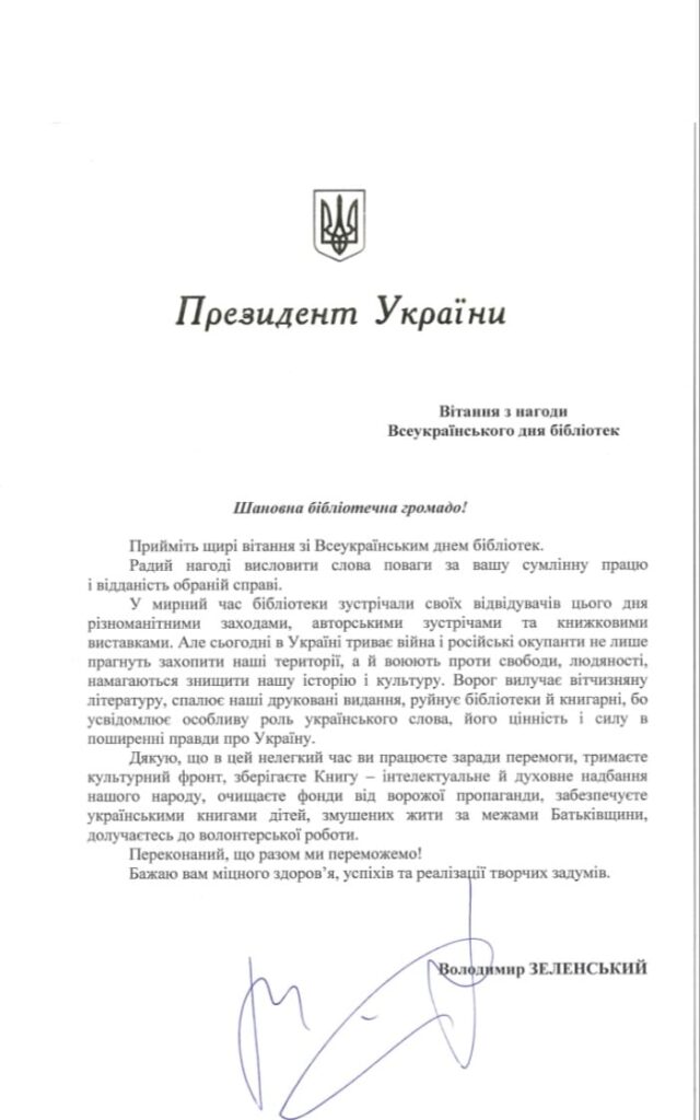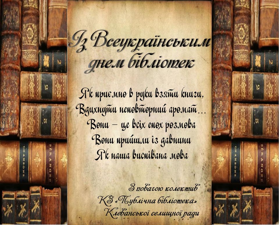 Дорога бібліотечна спільното: колеги та ветерани бібліотечної справи, від щирого серця вітаю вас з Всеукраїнським днем бібліотек. Хоч зараз і не легкий час, але бібліотечні працівники завжди відповідальні, працелюбні та віддані своєму покликанню, щораз доводять, що бібліотечна ланка є незамінною та важливою складовою одного великого механізму – “КУЛЬТУРИ”. Сьогодні ми з вами стоїмо на варті української духовності та цінностей нашого народу. Є хранителями книг, історії та літературного надбання! Бажаю Вам щирої, незгасаючої Віри в майбутню Перемогу України. Надії на добро та найсвітліше світло! Любові та відданості професії! Заряджаймо своїм позитивом та оптимізмом! Здоров’я і щастя нехай завжди будуть з Вами, бо вони є наслідком ваших думок і дій. Все, про що ми думаємо, у що віримо та чим займаємось сьогодні, обумовлює майбутнє нашої країни, професії, книги, інтелектуального розвитку суспільства. Будьте успішні! Будьте мотивовані! Будьте мудрі!