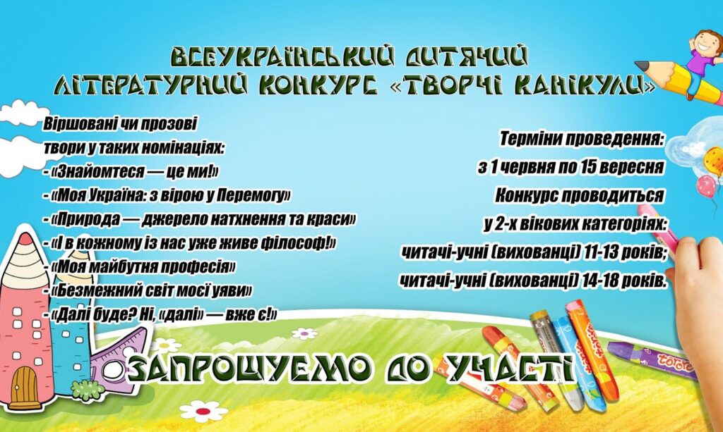 Увага!!! Оголошується Всеукраїнський дитячий літературний конкурс «Творчі канікули». Номінації: o «Знайомтеся — це ми!» o «Моя Україна: з вірою у Перемогу» o «Природа — джерело натхнення та краси» o «І в кожному із нас уже живе філософ!» o «Моя майбутня професія» o «Безмежний світ моєї уяви» o «Далі буде? Ні, «далі» — вже є!». Терміни проведення: з 1 червня по 15 вересня. Обсяг не більше 8 сторінок у форматі Microsoft Word або RTF, шрифт – Times New Roman (12 розмір), 1,5 міжрядковий інтервал, усі поля – 1,5 см, сторінки формату А4, без ілюстрацій та додаткового оформлення. Учасники-автори зазначають свої дані (ПІБ, вік, домашню адресу, контактний телефон) на останній сторінці конкурсної роботи (документ у формат Microsoft Word або RTF) та додатковим вкладенням (окремим файлом у форматі JPG) прикріплюють своє портретне фото. Конкурс проводиться у 2-х вікових категоріях: читачі-учні (вихованці) 11-13 років; читачі-учні (вихованці) 14-18 років. Віршовані чи прозові твори учасників просимо надсилати до обласного оргкомітету конкурсу на електронну адресу: odb-metod@ukr.net до 10 вересня. Обов’язково вказати ПІБ, домашню адресу та контактний телефон. Окремим файлом додати фото учасника Конкурсу. Переможців чекають дипломи та подарунки. Кращі твори увійдуть до щорічного збірника за підсумками Конкурсу.