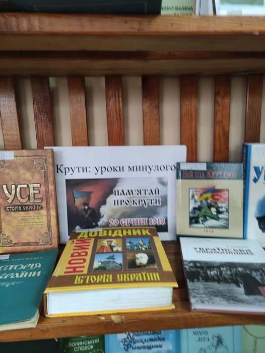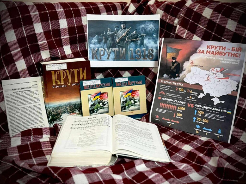 Щорічно 29 січня відзначають річницю бою під Крутами, знову і знову повертаючись до бою між українськими військовими курсантами та військами Червоної армії під командуванням капітана Муравйова під Крутами. 29 січня 1918 року на залізничній платформі в Крутах до 520 українських вояків і студентів з 16 кулеметами та однією гарматою дали бій росіянам, які мали десятикратну перевагу в живій силі, бронепотягах та артилерії. Бій під Крутами тривав близько шести годин, у ньому загинули від 70 до 100 бійців з української сторони. Втрати більшовицьких військ тоді сягнули 300 людей. Українці затримали росіян на чотири дні, що дало змогу укласти Берестейський мирний договір. З метою вшанування пам’яті полеглих воїнів у відділі обслуговування користувачів підготували книжкову виставку «Крути 1918»