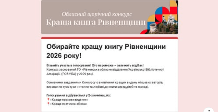Завершується онлайн та офлайн голосування в межах щорічного обласного конкурсу «Краща книга Рівненщини» в номінаціях «Краще прозове видання» та «Краща поетична збірка». До 01 лютого цього року у користувачів нашої бібліотеки ще є можливість проголосувати за краще краєзнавче видання. Отож, голосуємо!