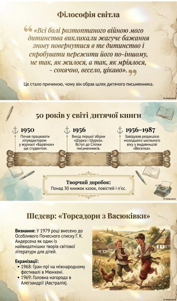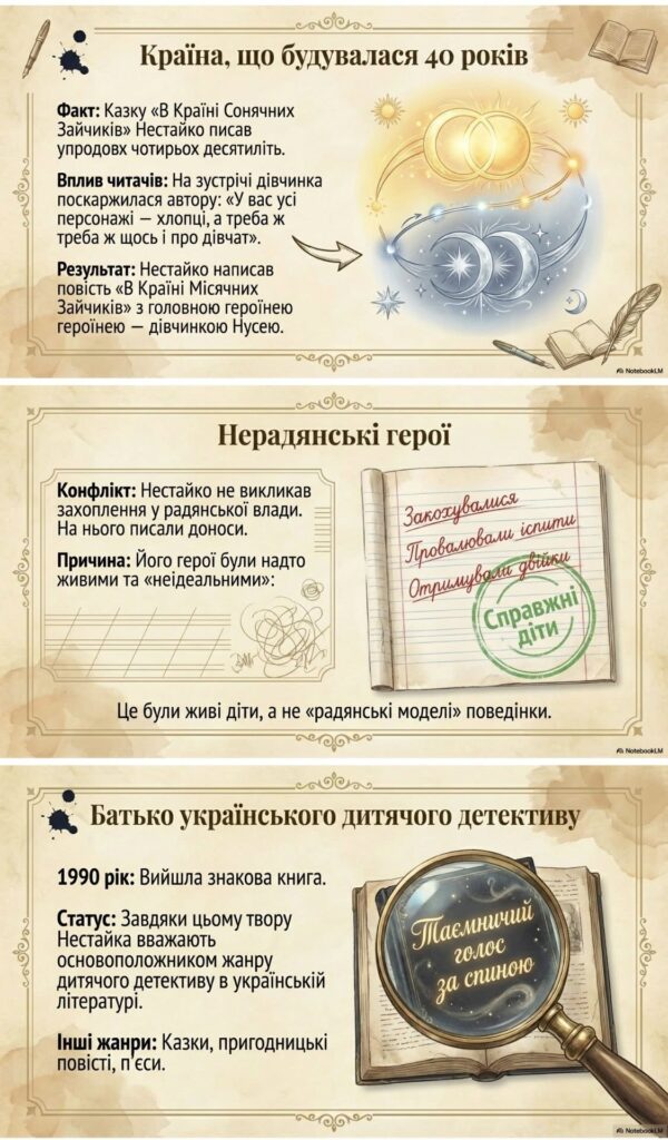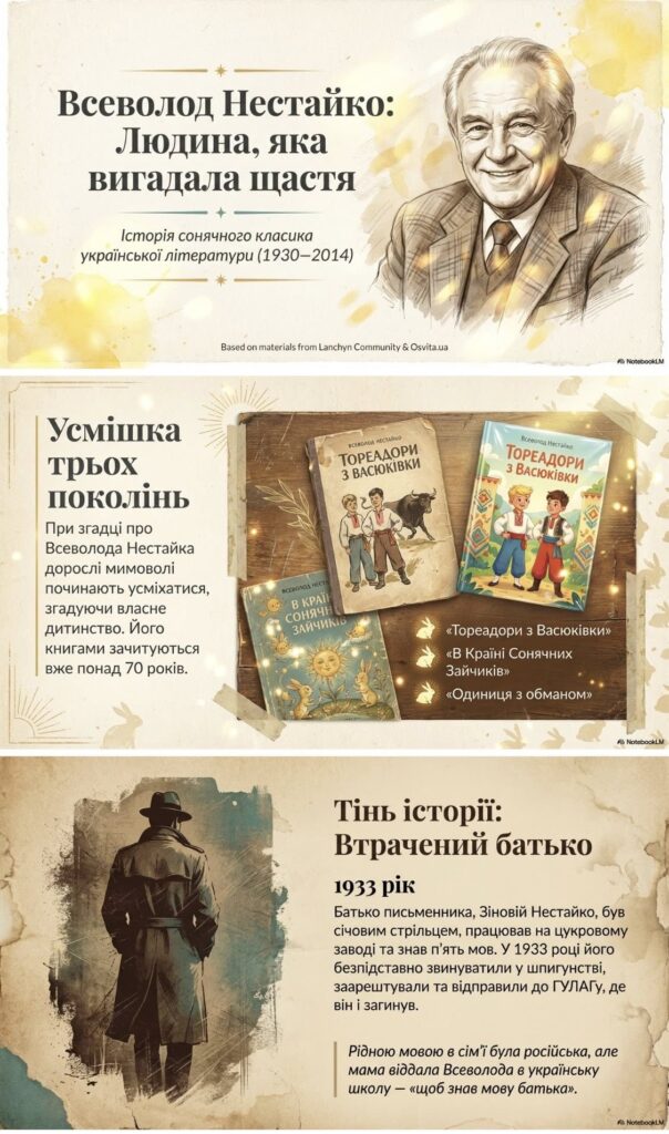 30 січня 1930 року в м. Бердичеві (на Житомирщині) народився Всеволод Нестайко – письменник, автор пригодницьких книжок для дітей та підлітків, один із найпопулярніших дитячих авторів кінця ХХ – початку ХХІ століття. (Презентація генерована ШІ)